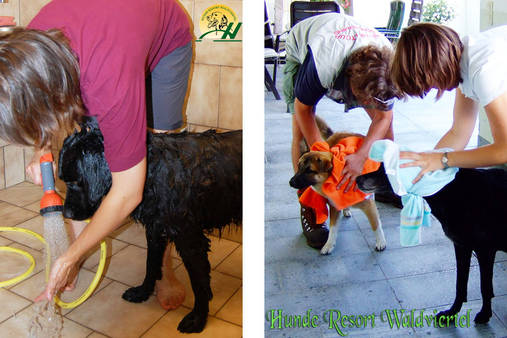 In den Außentüren zum Hof sind jeweils Hundeklappen eingebaut, wodurch sich die Hunde in beiden Häusern und dem großen Innenhof frei bewegen können.